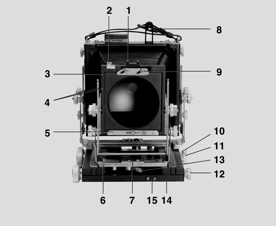 5. Push front standard(3) down until it almost touches camera bed(14).