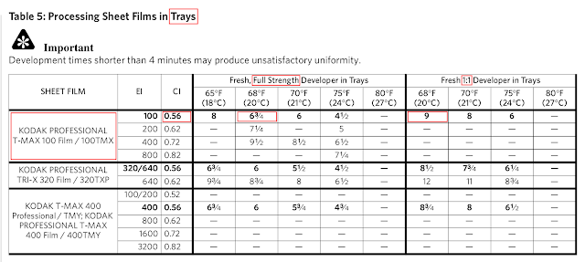 Choose the appropriate development time and temperature table for starting-point recommendations for specific films in small tanks, tray, and rotary tubes.