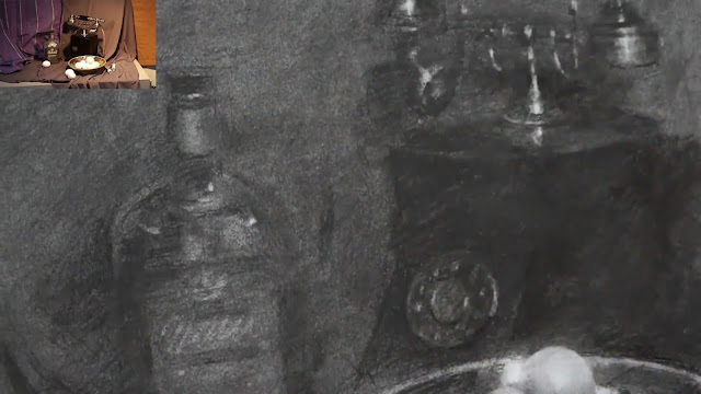1. 炭精筆的靜物: 背景深色, 金屬, 玻璃瓶道具, 突顯金屬和玻璃的質感.